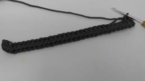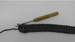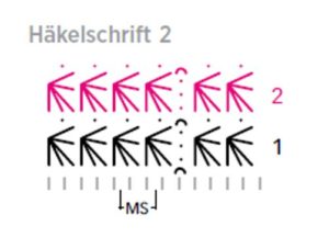 Beidseitig der Luftmaschenkette den Mustersatz (MS) 8 x wiederholen. In die 1. und letzte Luftmasche werden in der 1. Runde insgesamt jeweils 5 feste Maschen gearbeitet.