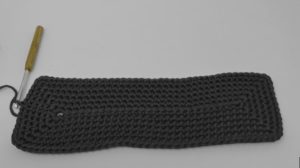 Nach der 1. Runde sind 62 feste Maschen in Arbeit. Anschließend die 2.-4. Runde laut Häkelschrift arbeiten, dabei jedoch die Zunahmen nicht in den Ecken arbeiten, sondern für eine ovale Form in jeder Runde jeweils rechts und links innerhalb der Rundung verteilt 4 Maschen zunehmen = 8 Zunahmen je Runde. Für die 5. und 6. Runde die Maschen genauso zunehmen. Nach 6 Runden ab Anschlag befinden sich 102 Maschen in Arbeit.