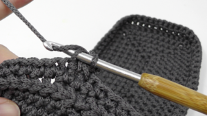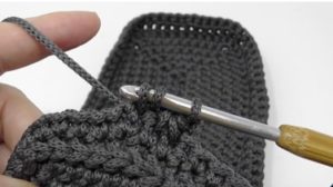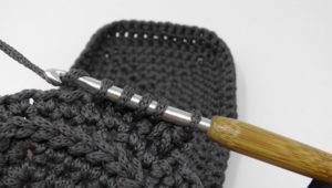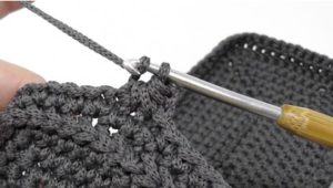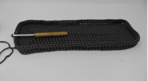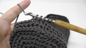 Im Anschluss den Boden wie folgt umhäkeln: Für die Kante alle Maschen mit 1 Runde Relief-feste-Maschen behäkeln. Dafür von hinten nach vorn und wieder von vorn nach hinten um die darunterliegende Masche einstechen und 1 feste Masche arbeiten.