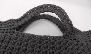 In der folgenden Runde feste Maschen häkeln und für die Henkel die markierten Maschen mit 20 Luftmaschen übergehen. In der folgenden Runde wieder feste Maschen häkeln und die Luftmaschenkette ebenfalls mit festen Maschen überhäkeln. Anschließend noch 2 weitere Runden feste Maschen häkeln, dabei über den Henkelmaschen jeweils tiefergestochene feste Maschen häkeln und dabei in die Luftmaschen einstechen. So werden in jeder Runde die festen Maschen nochmals überhäkelt wodurch der Henkel zum Griff wird.